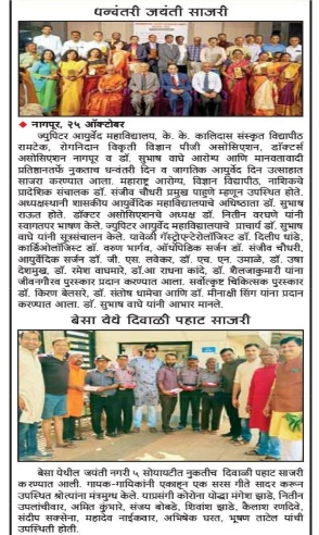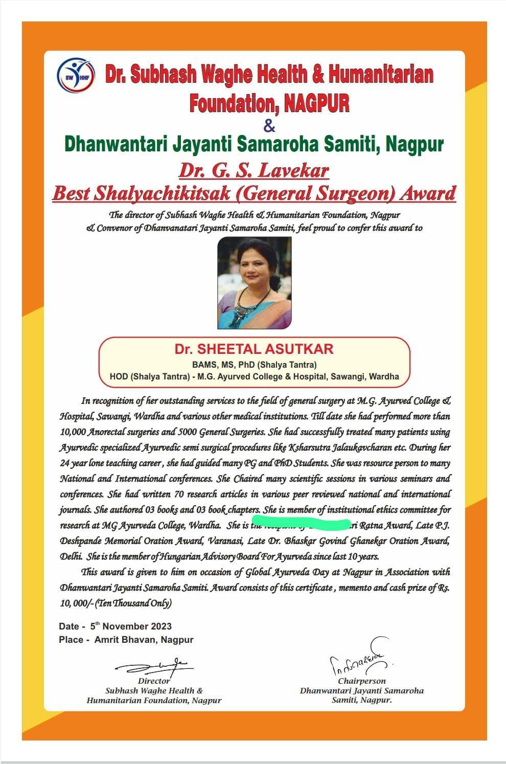 | 1 | 2023, Amrit Bhavan Nagpur | Dr. Subhash Waghe Foundation | Dr. G. S. Lavekar - Best Shalyachkitsak Award | Dr. Sheetal Asutkar (Wardha) |  |  |  |