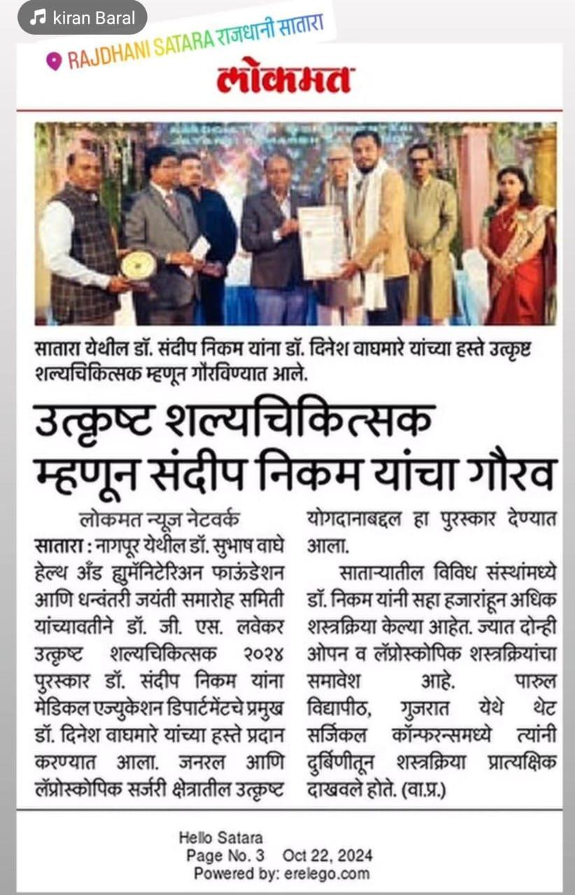 | 1 | 2024, Amrit Bhavan Nagpur | Dr. Subhash Waghe Foundation | Dr. G. S. Lavekar - Best Shalyachkitsak Award | Dr. Sandip Nikam (Satara) |  |  |  |