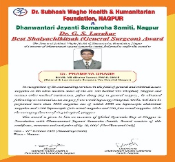 | 1 | 2022, Hotel Regenta Nagpur | Dr. Subhash Waghe Foundation | Dr. G. S. Lavekar - Best Shalyachkitsak Award | Dr. Prameya Dhage (Nagpur) |  |  |  |