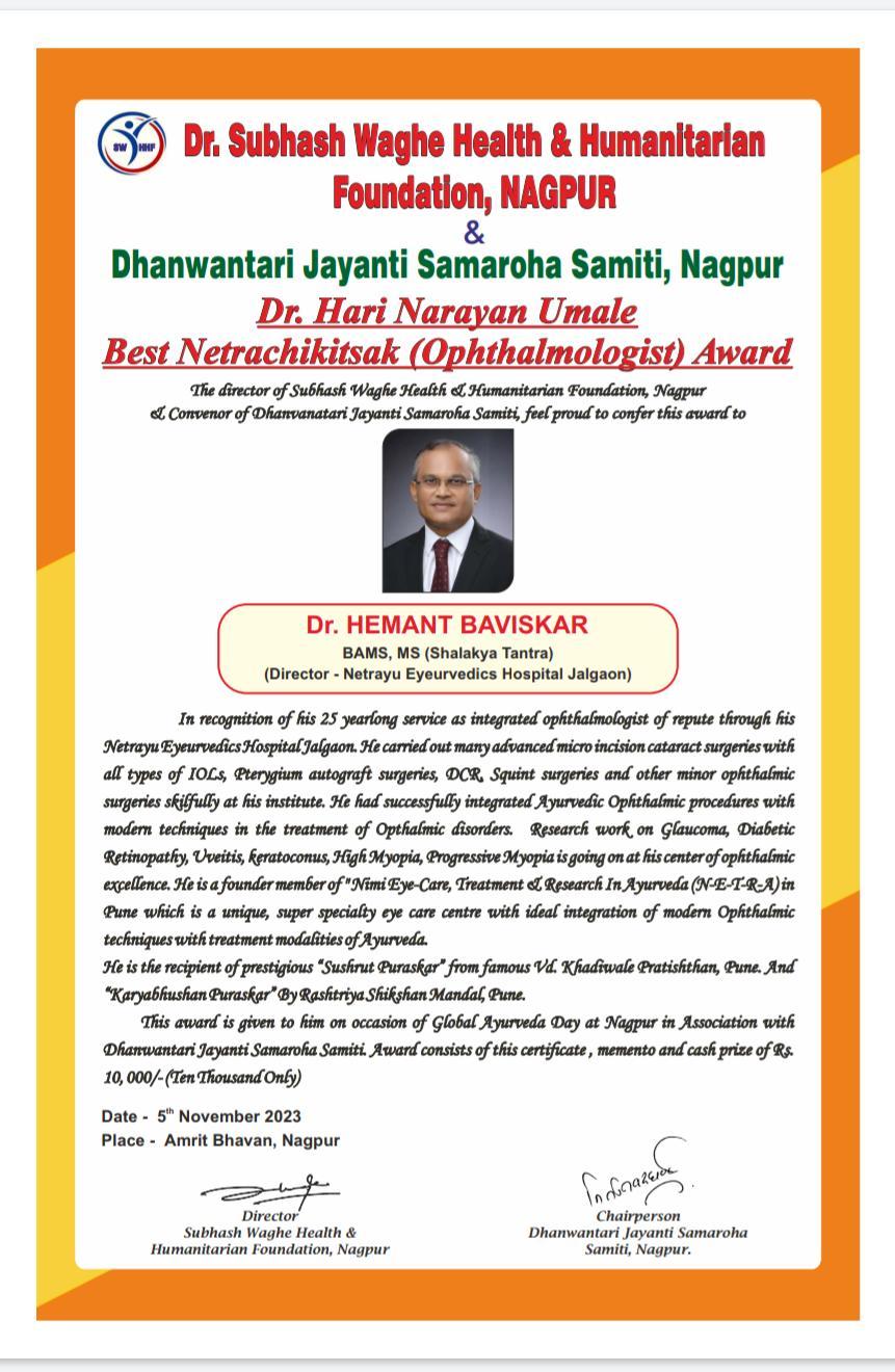 | 2 | 2023, Amrit Bhavan Nagpur | Dr. Subhash Waghe Foundation | Dr. H. N. Umale - Best Netrachikitsak Award | Dr. Hemant Baviskar (Jalgaon) |  |  |  |