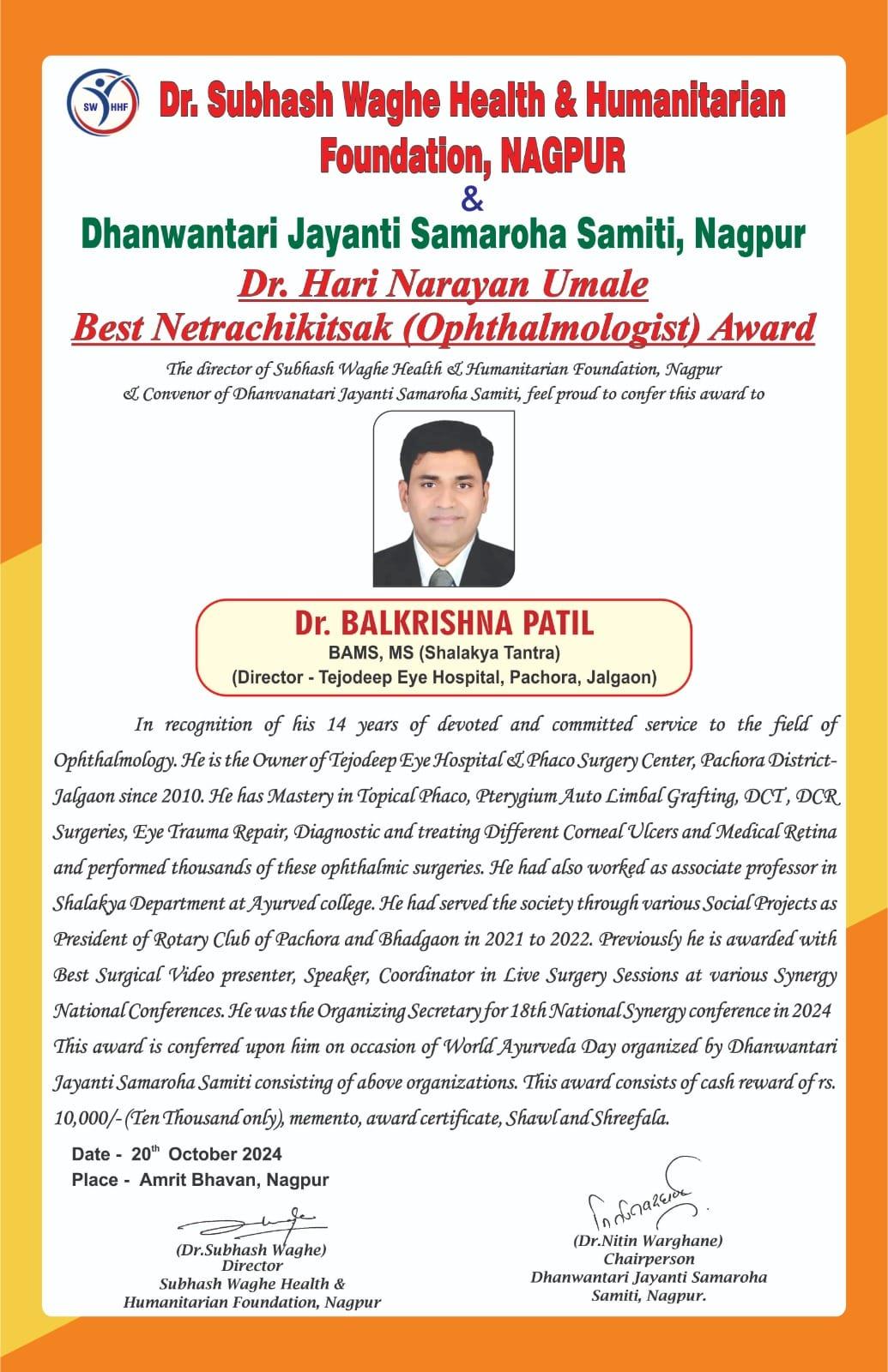 | 2 | 2024, Amrit Bhavan Nagpur | Dr. Subhash Waghe Foundation | Dr. H. N. Umale - Best Netrachikitsak Award | Dr. Balkrishna Patil (Pachora) |  |  |  |