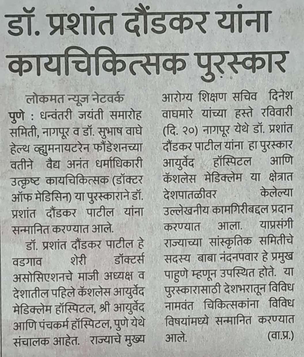 | 3 | 2024, Amrit Bhavan Nagpur | Dr. Subhash Waghe Foundation | Vd. Anant Dharmadhikari - Best Kayachikitsak Award | Dr. Prashant Daundkar (Pune) |  |  |  |